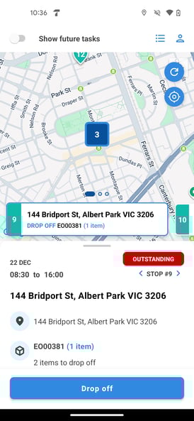The Driver App Map View allows drivers to visualise all tasks for a selected date on a live map.