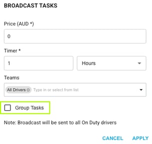 Orders can now be broadcast individually, allowing drivers to accept specific jobs rather than receiving all broadcast orders in bulk. You can still select to group tasks by selecting the Group Tasks toggle.